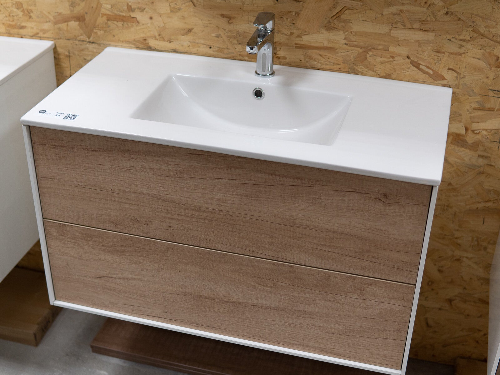 Wavedesign badkamermeubel. Model: Novara. Afmeting: ca.: 90 x 45 Kleur: Wit-Eiken. Bestaande uit: Onderkast met 2 push-open laden en een keramische wastafel. Met als extra wastafelkraan t.w.v. € 145,- Let op ! Geleverd wordt zoals in omschrijving, eventuele randartikelen zichtbaar op foto’s of afbeeldingen worden indien niet beschreven niet meegeleverd. Winkelverkoopprijs: € 1.325,-
