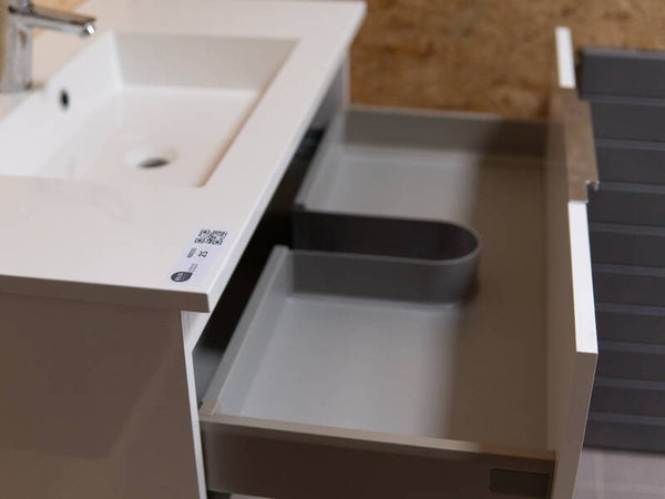 Wavedesign badkamermeubel. Model: San Marino. Afmeting: ca.: 90 x 45 Kleur: Hoogglans antraciet. Bestaande uit: Onderkast met 2 laden en een mineraal marmeren wastafel. Let op ! Geleverd wordt zoals in omschrijving, eventuele randartikelen zichtbaar op foto’s of afbeeldingen worden indien niet beschreven niet meegeleverd. Winkelverkoopprijs: € 1.345,-