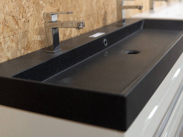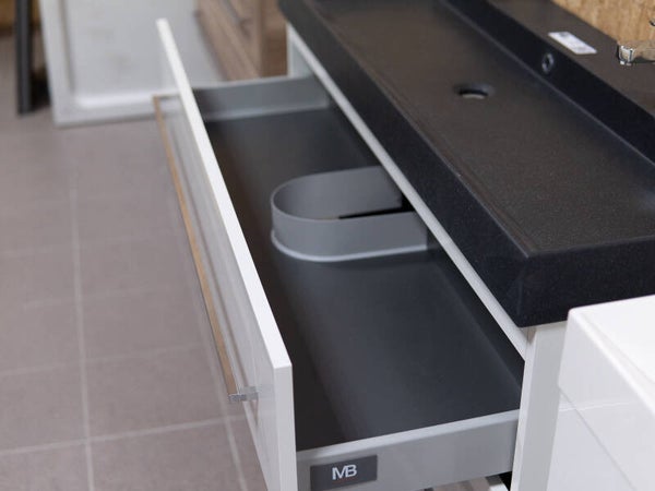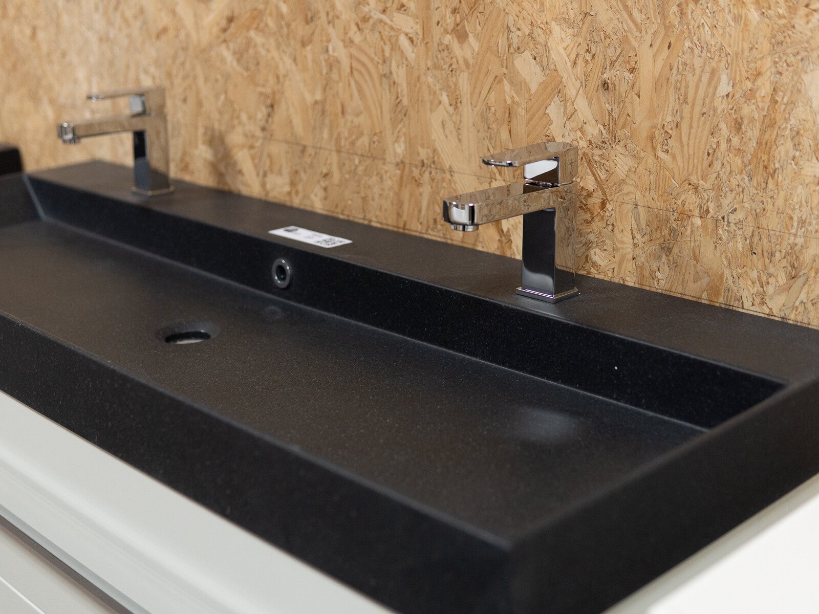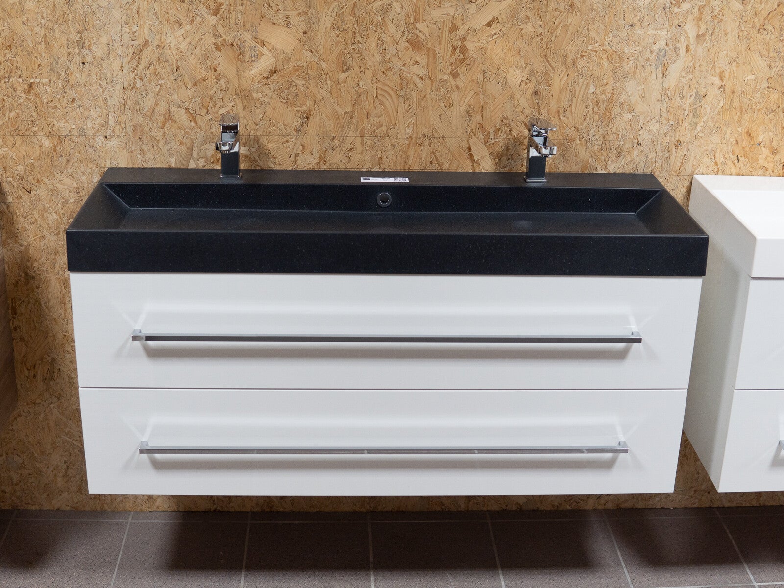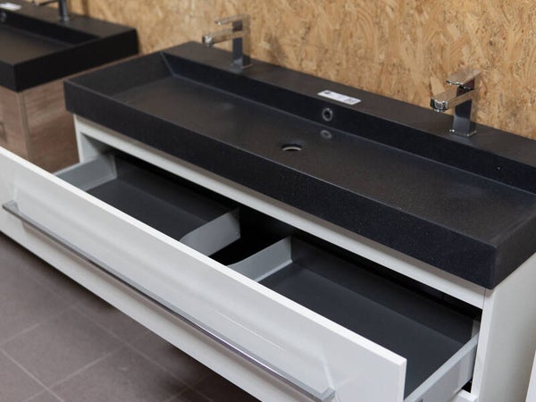 Wavedesign badkamermeubel. Model: Cortona. Afmeting: ca.: 125 x 45 Kleur: Eiken. Bestaande uit: Onderkast met 2 laden en een mineraal marmeren zwarte wastafel. Met als extra 2 wastafelkranen t.w.v. € 175,- p/st. Let op ! Geleverd wordt zoals in omschrijving, eventuele randartikelen zichtbaar op foto’s of afbeeldingen worden indien niet beschreven niet meegeleverd. Winkelverkoopprijs: € 1.985,-