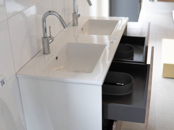 Wavedesign badkamermeubel. Model: Novara. Afmeting: ca.: 120 x 45 Kleur: Wit-Hout Bestaande uit: Onderkast met 4 pushladen en een mineraal marmeren wastafel. Met als extra 2 wastafelkranen t.w.v. € 195,- p/st. Let op ! Geleverd wordt zoals in omschrijving, eventuele randartikelen zichtbaar op foto’s of afbeeldingen worden indien niet beschreven niet meegeleverd. Winkelverkoopprijs: € 2.435,-