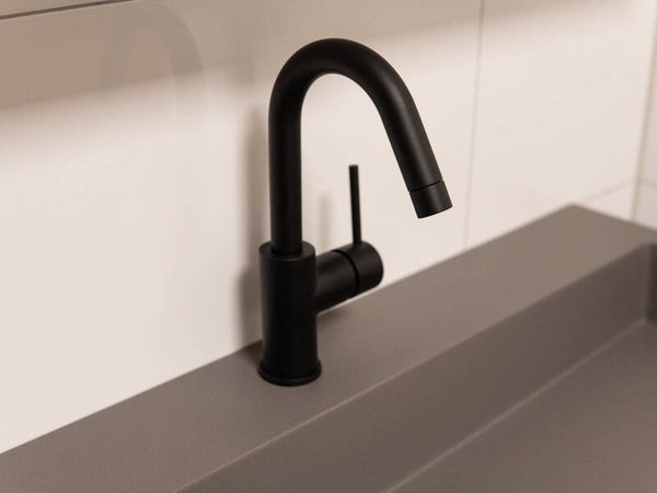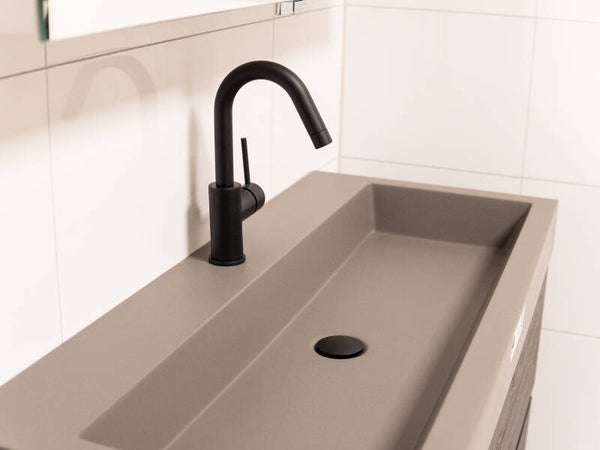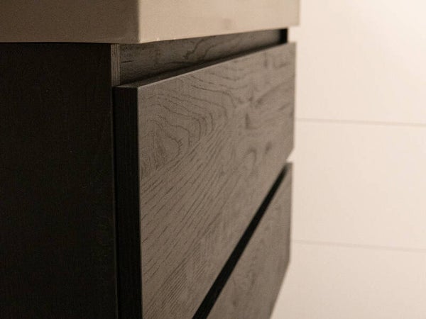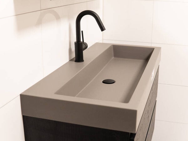 Blizz showroommeubel, ca. 100 x 45 (lxd), kleur: zwart gerookt eiken. Betreft: de onderkast met 2 laden, wastafel quartz beton en een mat zwarte Xenz wastafelkraan. Geleverd wordt zoals in omschrijving, eventuele randartikelen zichtbaar op foto’s of afbeeldingen worden indien niet beschreven niet meegeleverd. Winkelverkoopprijs: € 2.115,-