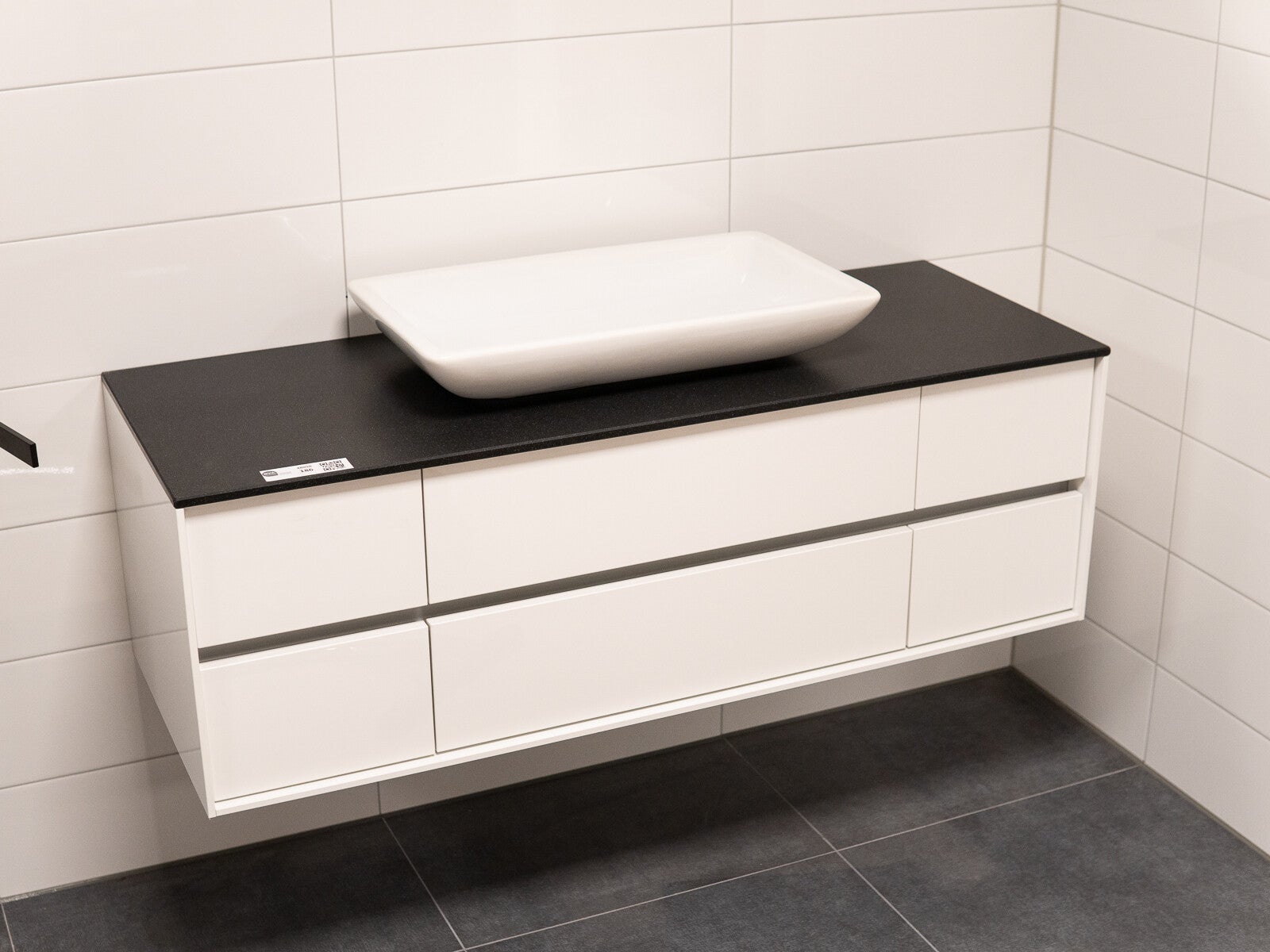 Thebalux showroommeubel, maatwerk, 140 x 45 cm breed, kleur: Hoogglans wit. Betreft: de onderkast met 6 laden, keramische wastafel op stone blad zwart. Geleverd wordt zoals in omschrijving, eventuele randartikelen zichtbaar op foto’s of afbeeldingen worden indien niet beschreven niet meegeleverd. Winkelverkoopprijs: € 1.915,-